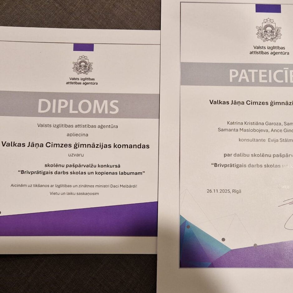 26. novembrī Rīgā notika Pašpārvalžu konkursa “Brīvprātīgais darbs skolas un kopienas labumam” noslēguma pasākums, uz kuru bija aicināti labākie projekta darbi. VJCĢ skolēnu pašpārvaldes iesniegtais brīvprātīgā darba projekts bija pastaigas maršruta “Walk. Cimzes ceļš” bukleta izveide. Projektu izstrādāja Katrīna Kristiāna Garoza, Samanta Zālīte, Ance Gindra, Samants Maslobojeva un Sāra Mezīte, projekta konsultante Evija Stālmeistere.