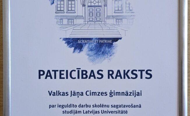 Valkas Jāņa Cimzes ģimnāzija saņem Latvijas Universitātes (LU) atzinības rakstus par sekmīgu skolēnu sagatavošanu studijām augstākās izglītības iestādē