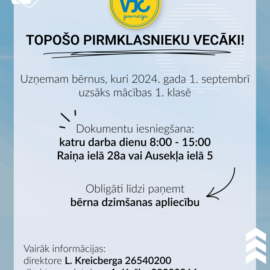 Uzņemam bērnus, kuri 2024. gada 1. septembrī uzsāks mācības 1. klasē.